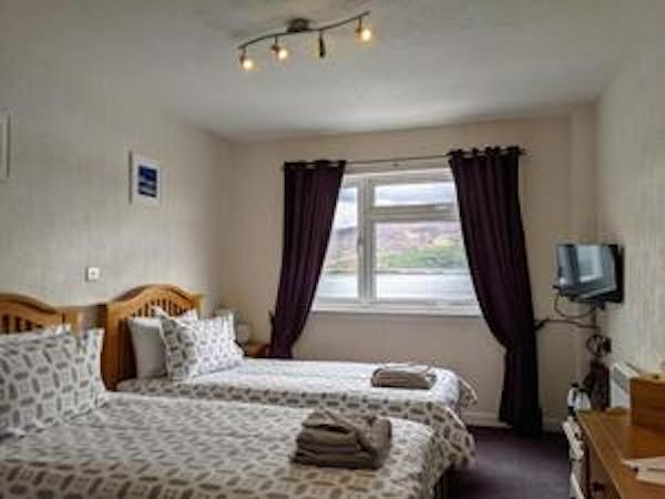 Our Twin Room with a private bathroom, unfortunately the bathroom is not located within the room, the bathroom is located 1 meter across the hall from the room and is private to the room only. The room has stunning sea loch views of Lochcarron and the surrounding area. This well appointed room has free wifi, tea & coffee making facilities, slippers & robes and a television. You will find this room welcoming and comfortable whether your visit is business or pleasure.
